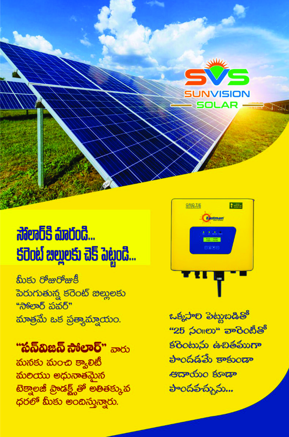 Sun Vision Solar is an Indian solar energy firm specializing in designing and installing solar systems for residential, commercial, and industrial customers .